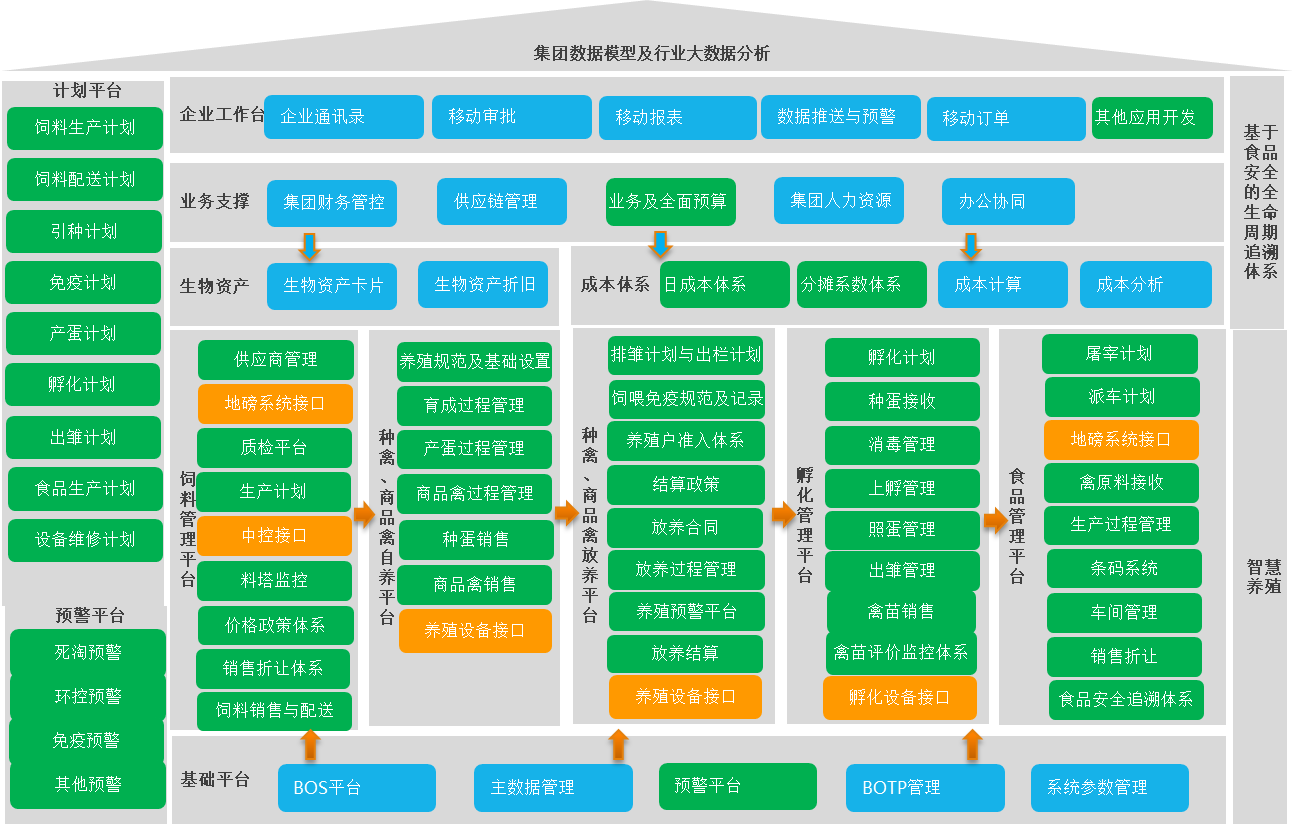 ●将飼料、育種、孵化(huà)、養殖、屠宰等産業(y♠è)鏈融合,形成一(yī)體(tǐ)化(huà)管控平台,實現(xiàn)集團管理(lǐ)的(de)統一(yī)劃、規範化(huà)、快(kuài)速擴展化(huà)α。統一(yī)指定标準和(hé)內(nèi)控體(tǐ)系支撐跨公司、跨區(qū)域的(de)集團化(huà)管控;