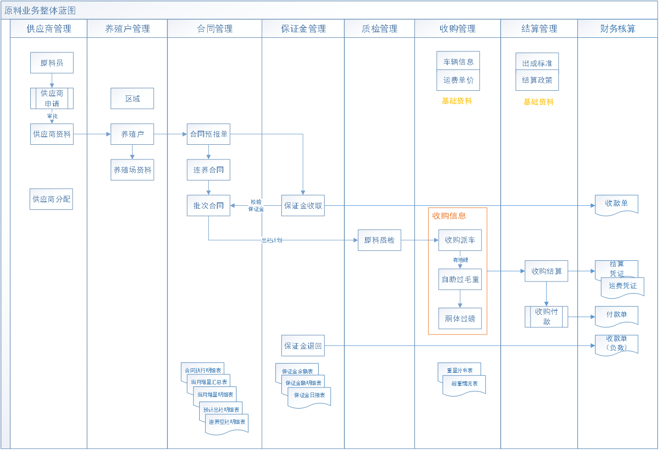 ■原料管理(lǐ)平台:以批次合同為(wèi)主線,通(tōng)過信息化(huà)手段加強整個(gè)原料管理(lǐ)過程的(de≠)監管。合同在簽訂通(tōng)過審核之後,會(huì)成為(wèi)整個(gè)原料管理(lǐ)過程中的(de)一(yī)條中心線,保證金(jīn)→收取、出成标準計(jì)算(suàn)、回收價格、等等必須以合同為(wèi)準,不(bù)得(de)随意→改動。軟件(jiàn)将實現(xiàn)從(cóng)連養合同空(kōng)欄、批次合同、批次合同保證金(jīn)、回收派車(chē)、回收過磅、原料質檢、回收結&算(suàn)與付款等全過程的(de)流程化(huà)管理(lǐ),将使原料業(yè)務信息得(de)以集成共享,建立原¥料管理(lǐ)高(gāo)效的(de)、實時(shí)的(de)信息化(huà)管理(lǐ)平台,管理(lǐ)∏人(rén)員(yuán)可(kě)随時(shí)了(le)解各環節業(yè)務的(de)處理(lǐ)狀況并跟跟蹤查詢。支持棚前過磅、胴體(tǐ)過磅、毛重過磅等多(duō)種過磅方式結算(suàn)。